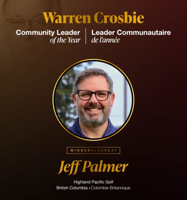 Jeff Palmer, General Manager at Highland Pacific Golf in Victoria, B.C., has been named the 2025 PGA of Canada Warren Crosbie Community Leader of the Year for his transformational commitment to community engagement, mental health advocacy, and inclusive leadership through the game of golf.